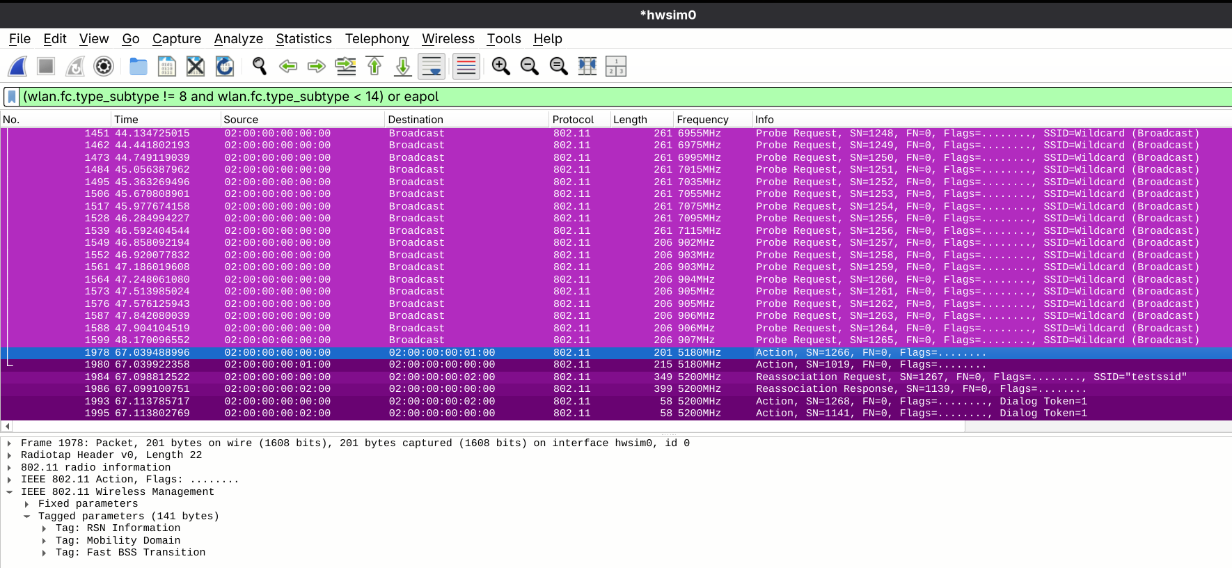 mac80211_hwsimpacket capture interface.As before, the client scans and roams based on cached scan results. However, unlike before, the Authentication frames and 4-way handshake are missing. There are also two new Action frames present before the Reassociation Request and Reassociation Response. This is expected!